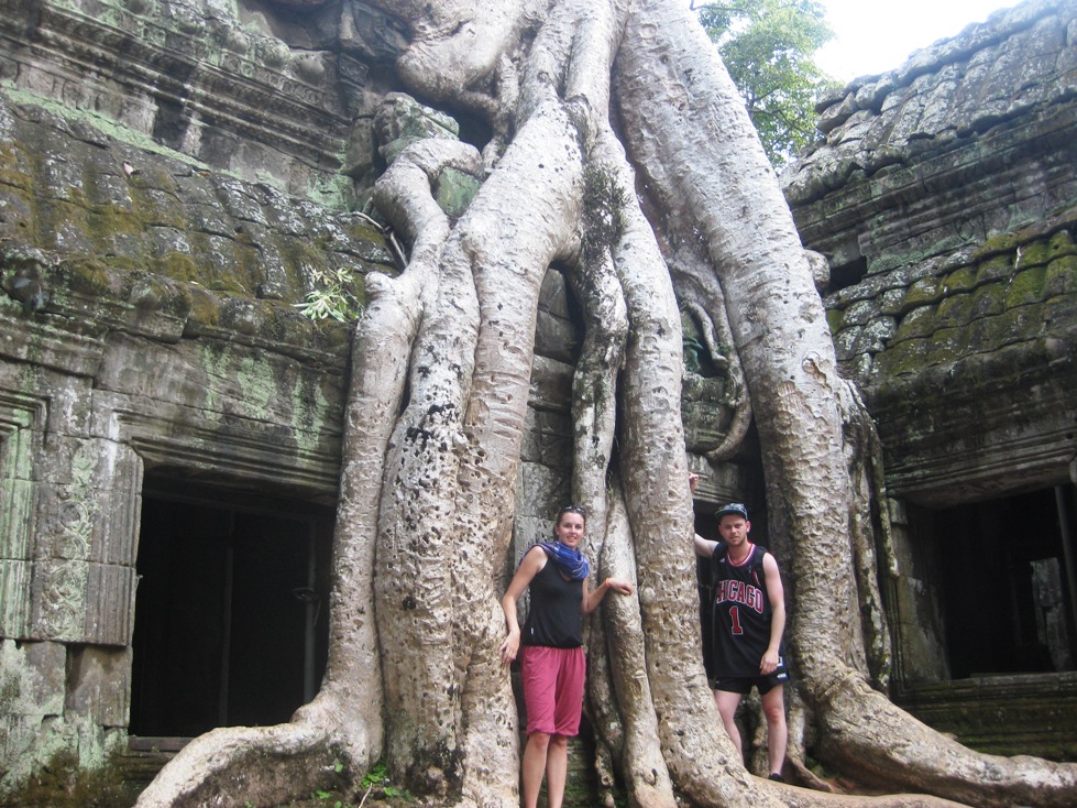 Ta Prohm (also called the Tomb raider temple) the most popular temple as it featured in the movie tomb raider. Tree roots strangle the stone throughout the temple